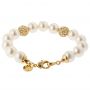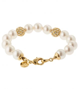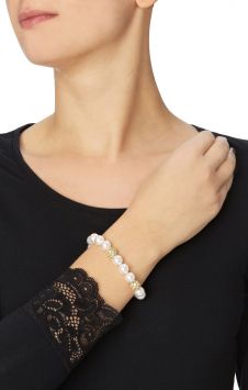Feines Perlenarmband in Deutschland gefertigt. Mit 13 SWAROVSKI Crystal Pearls und 2 Kugeln, den "Crystal Mesh Balls" mit SWAROVSKI ELEMENTS. Der Karabinerhaken aus Messing sowie ein Plättchen mit intarsierter Lilie und einer 23 Karat Vergoldung, verleihen dem Armband einen eleganten Abschluß.