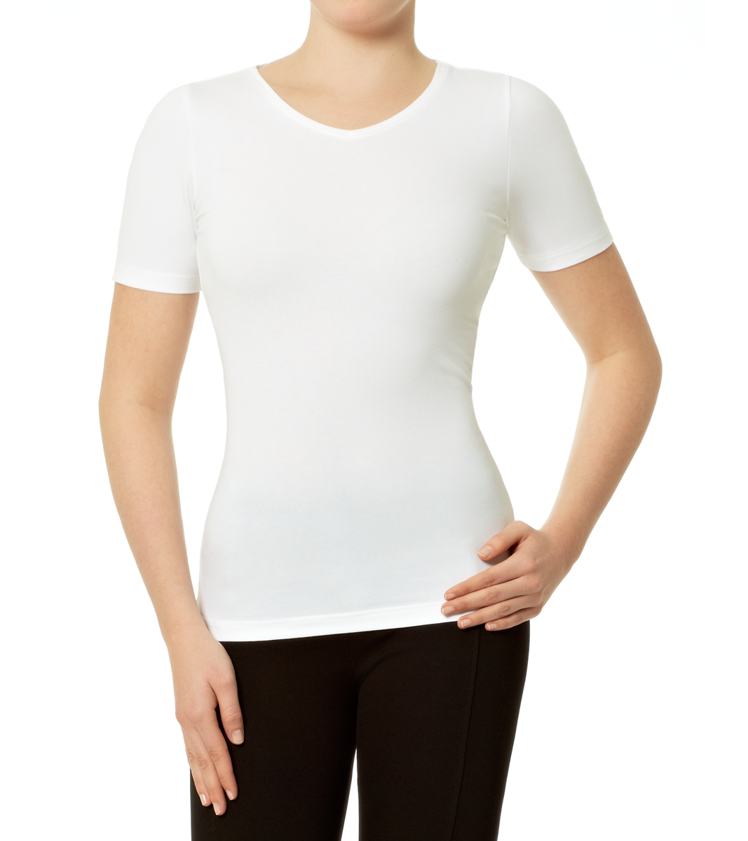 Das weiße Basic V-Ausschnitt Shirt mit kurzem Arm ist ein absoluter Klassiker und passt zu jedem Kleidungsstil und jeder Jahreszeit. Die hochwertige Verarbeitung der feinen Baumwolle verspricht Geschmeidigkeit und höchsten Tragekomfort. Das kompakte Material ist fest und dennoch herrlich weich. Das Shirt ist ideal für jede Jahreszeit.