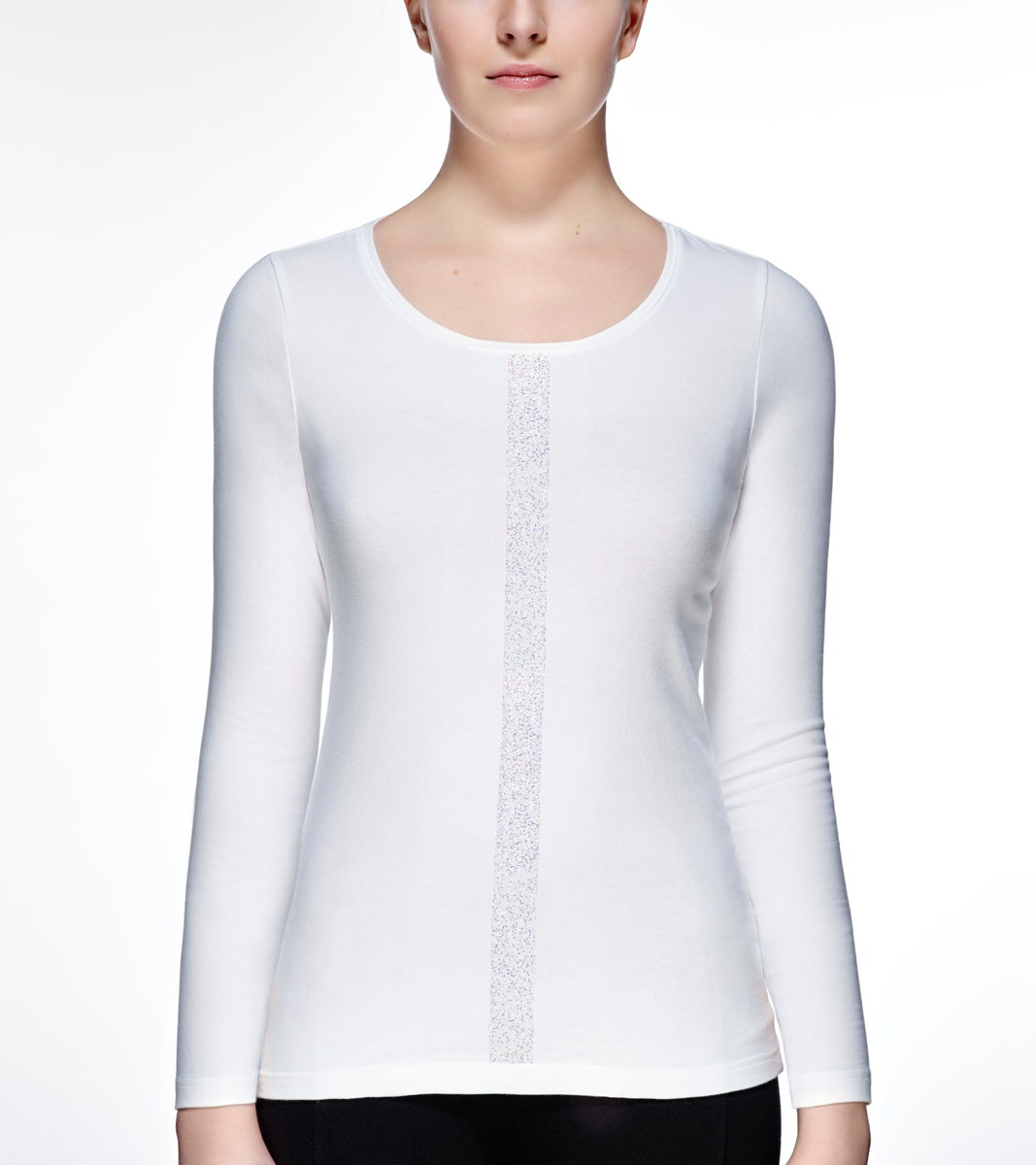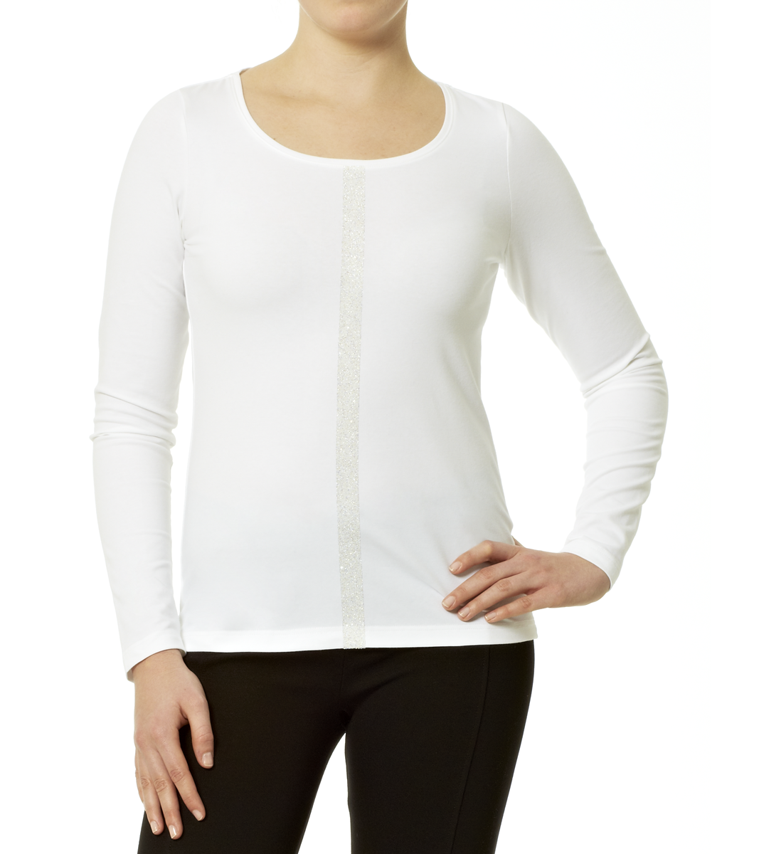 Das weiße Top mit langem Arm und vertikal aufgebrachten SWAROVSKI ELEMENTS verleiht dem klassischen Shirt einen Hauch von Extravaganz und dezente Eleganz. Wie alle amendia Shirts bietet die feine Baumwolle und deren hochwertige Verarbeitung Geschmeidigkeit und höchsten Tragekomfort. Das kompakte Material ist fest und dennoch herrlich weich. Das Zusammenspiel edler Baumwolle und hochwertiger Veredelungen machen das Shirt zu einem absoluten Lieblingsteil. Ideal für jede Jahreszeit. Auch mit 3/4 Arm, s. Shirt LEA und mit kurzem Arm, s. Shirt MIA erhältlich.