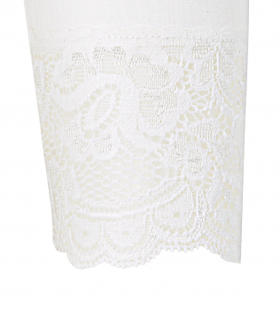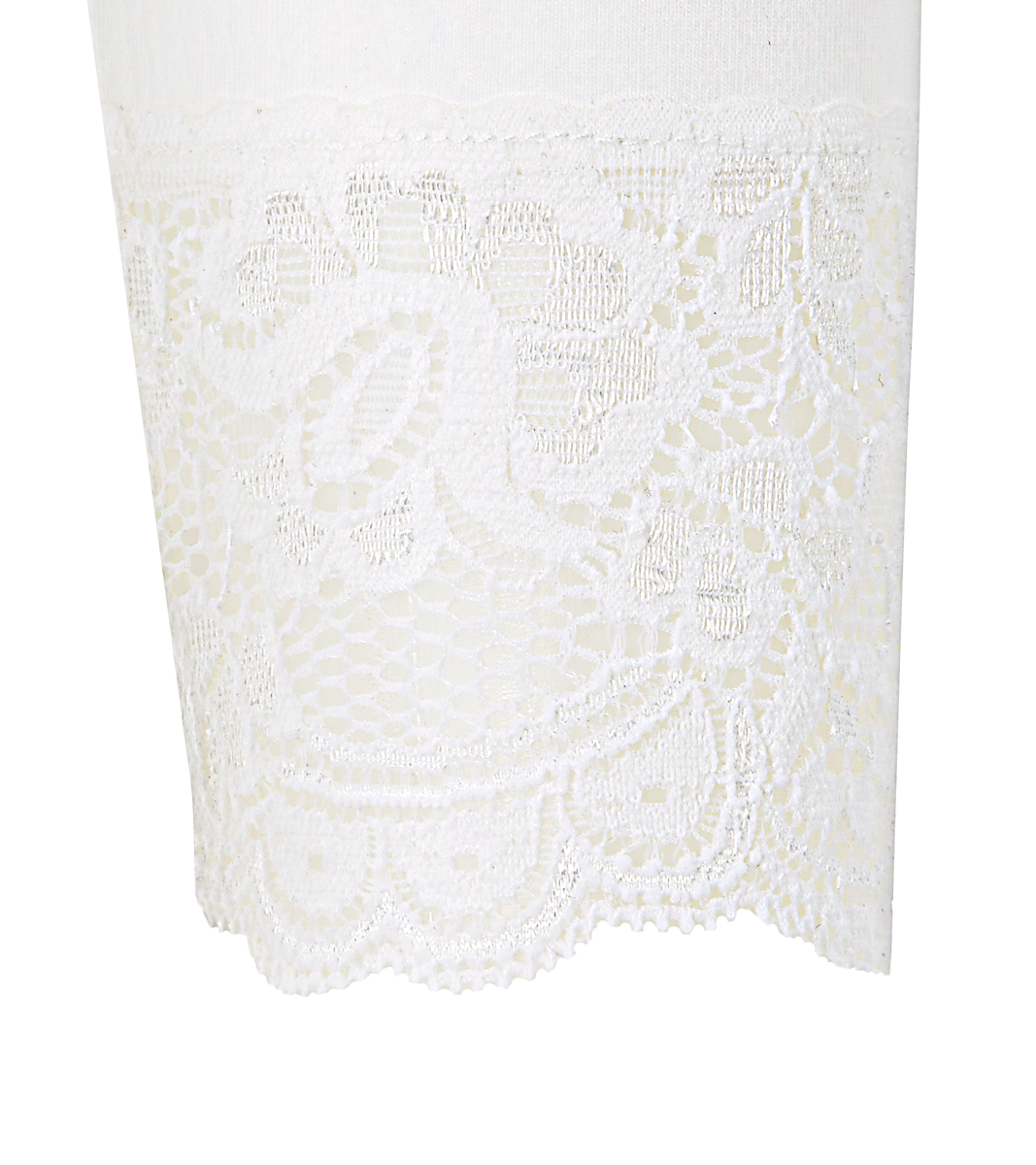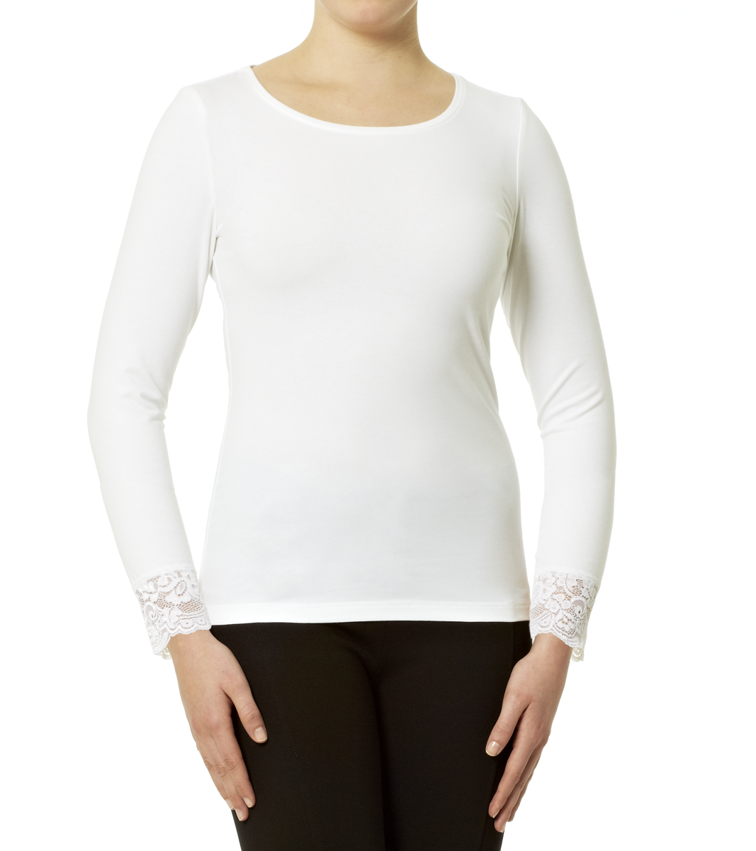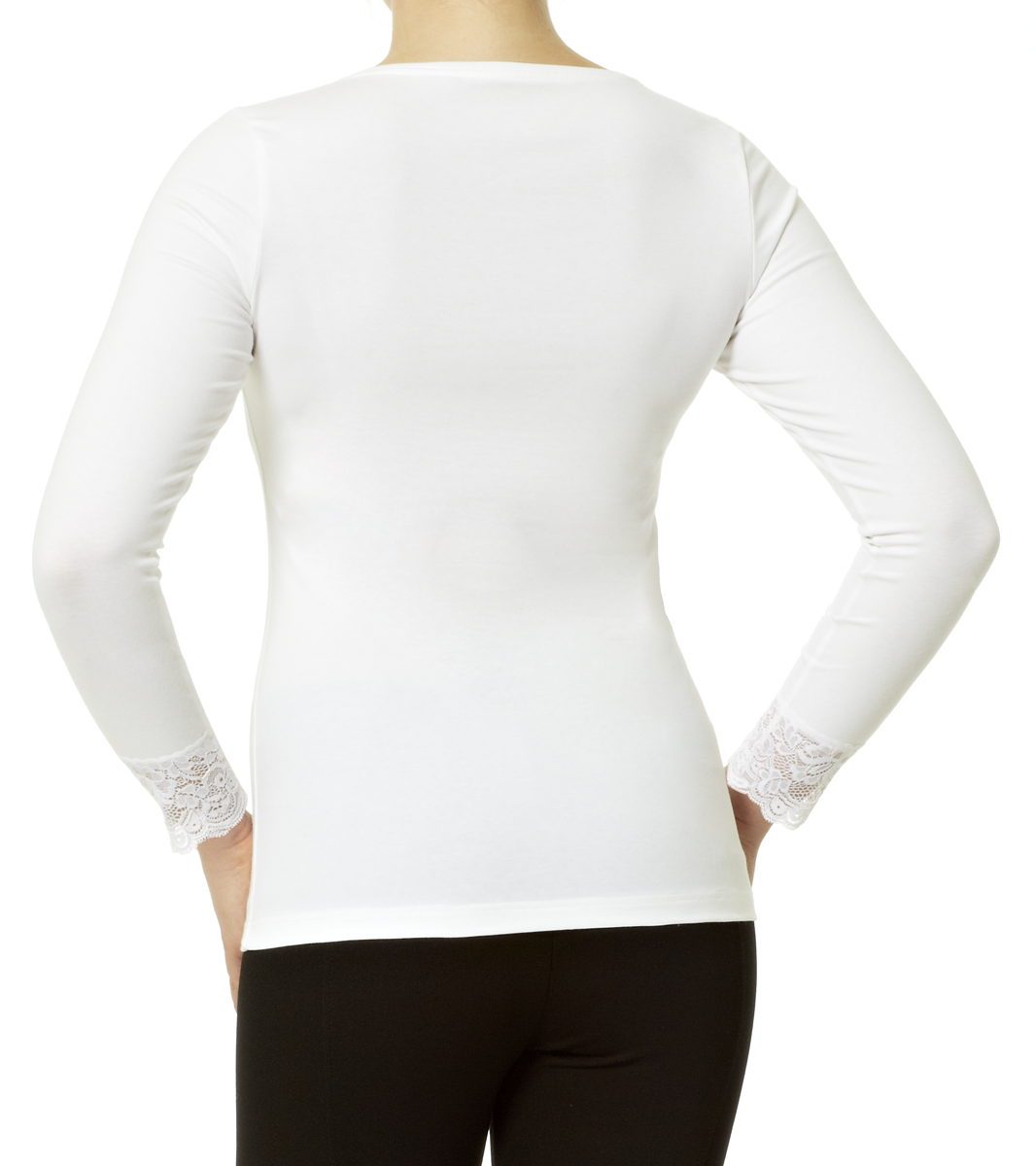 Das weiße Shirt ist die luxuriösere Variante des typisch klassischen Tops mit ¾-Arm Die hochwertige angesetzte Dresdner Spitze ist dehnbar und von feiner Qualität, wie auch die Baumwolle und die hochwertige Verarbeitung. Das kompakte Material ist fest und dennoch herrlich weich Das Shirt ist ideal für jede Jahreszeit.