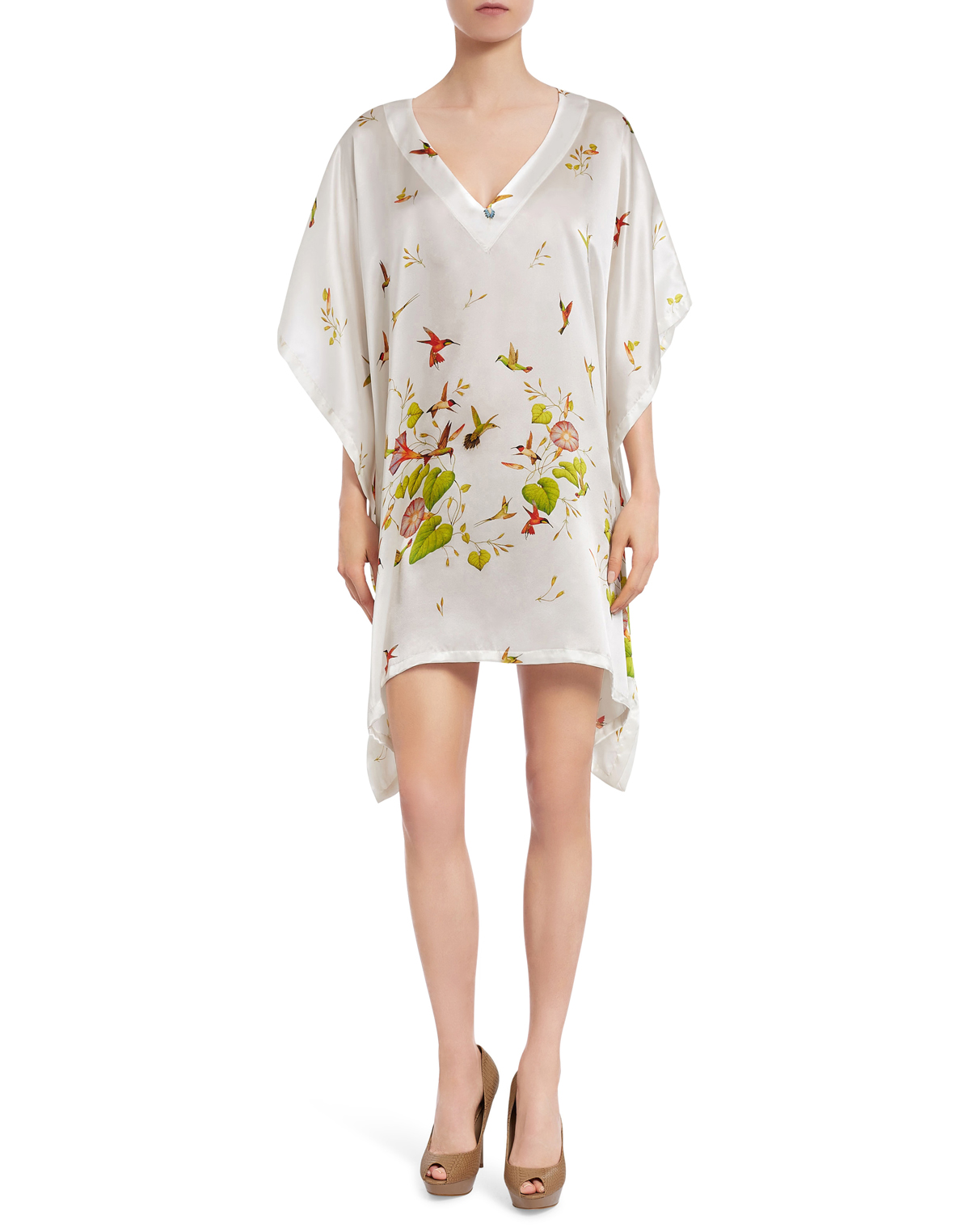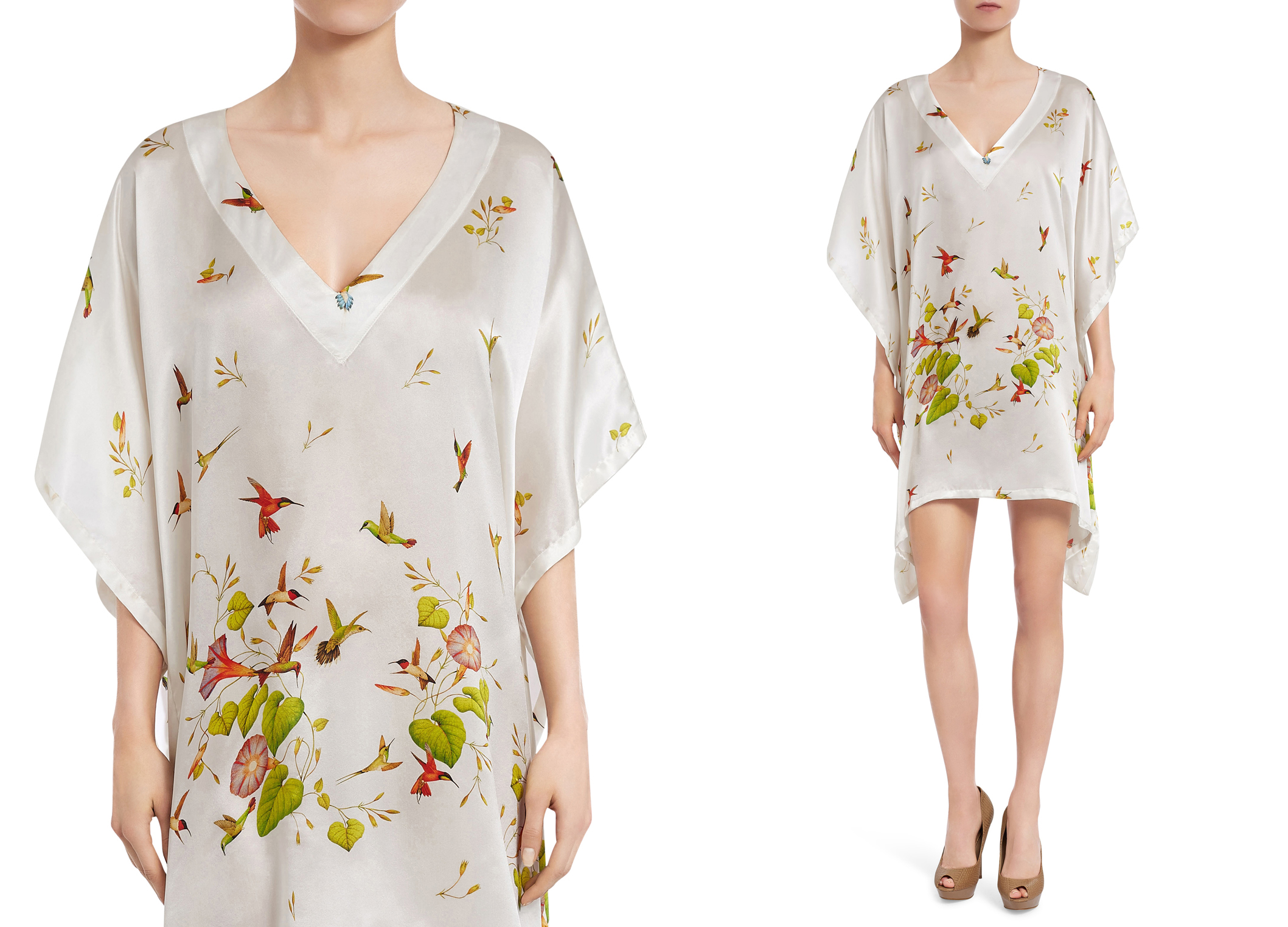 Feinste Seide aus Italien verarbeitet in federleichte Tuniken und Kaftane. Der bezaubernde Print beim Modell "BIRDS" mit kleinen bunten Vögeln auf weicher fließender Seide überzeugt mit einer dezenten Eleganz. Ein zeitloses "Keypiece", kombinierbar mit vielen exquisiten Teilen, z.B. mit schmalen Hosen. Am Strand und am Pool überzeugen die Tuniken und Kaftan auch ohne jede Kombination. Ready: to feel good.